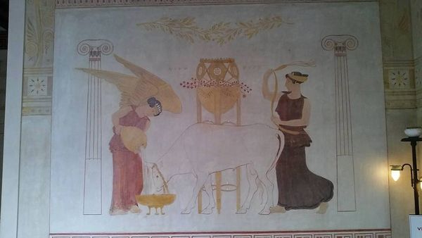 Iniziamo la visita dal pian terreno: noto che gli animali sono figure ricorrenti nella mitologia greca, del resto «Kérylos» significa «rondine di mare», l'uccello che annunciava presagi favorevoli …
