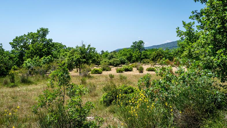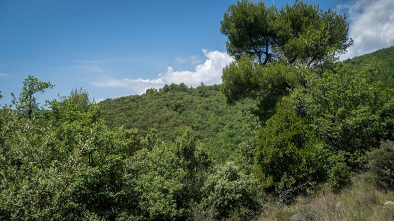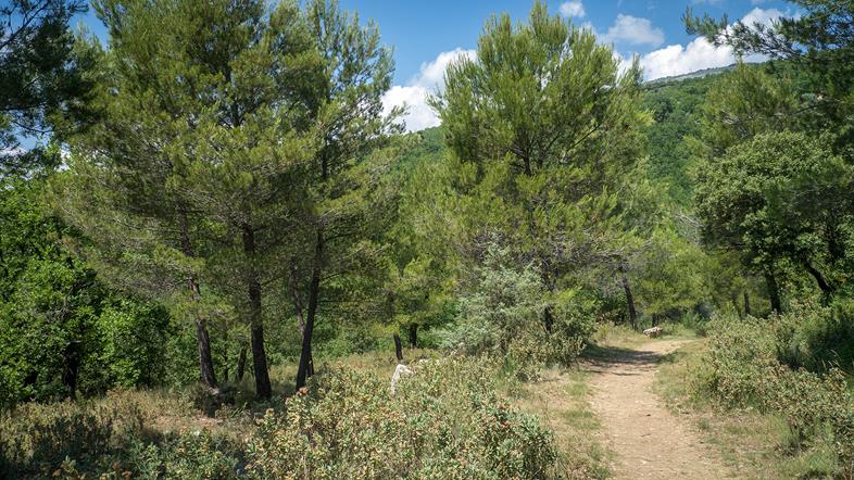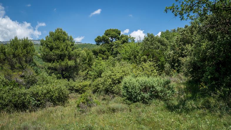 Oltre ci si addentra in una foresta mediterranea che circonda i prati: querce, lecci, pini marittimi e pini di Aleppo: un rifugio ideale per la vita di volpi, scoiattoli e molti uccelli e insetti.