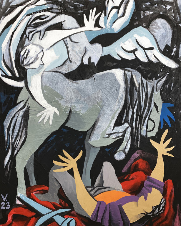 L’arte di Giorgio Vallorani nasce da un pensiero tradotto in immagine attraverso tecniche diverse e apparentemente antitetiche, un dialogo armonico in grado di produrre risultati originali, riconoscibili e dalla coinvolgente presenza cromatica. Digital painting, pittura tradizionale, disegno, collage, mosaico: sul supporto dell’opera vengono a interagire il classico con il contemporaneo, senza provocare cortocircuiti o contrasti, generando invece nuove opportunità percettive.