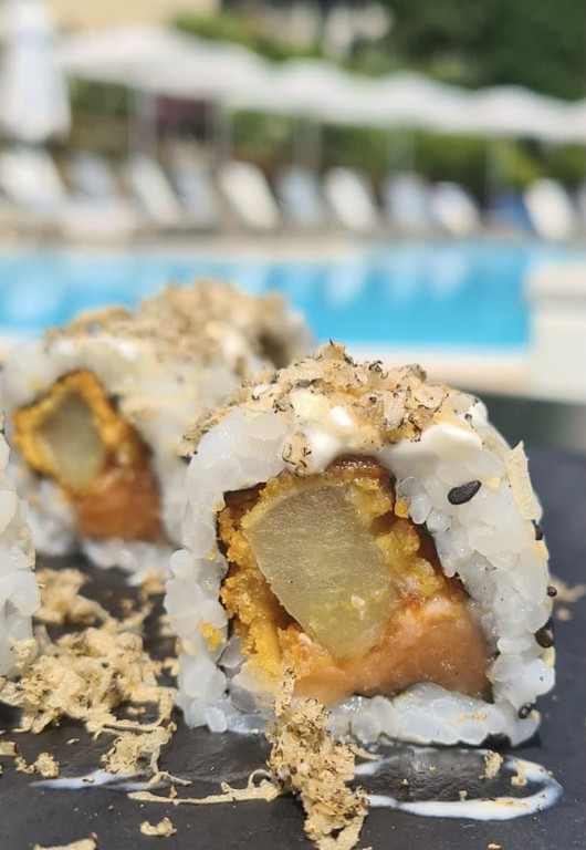 Il sushi contemporaneo sarà proposto con roll tradizionali come salmone e avocado abbinati a roll particolari e ricercati come gamberi rossi di Sanremo, nocciole e tartufo.
