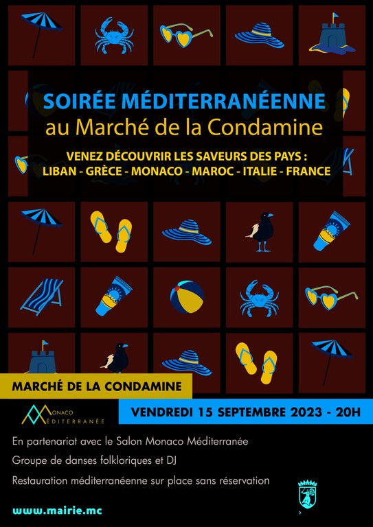 Nell'ambito del Salone «Monaco Méditerranée» che si terrà dal 15 al 17 settembre 2023 al Chapiteau dello Spazio Fontvieille, il Comune di Monaco organizza una grande serata sul tema del Mediterraneo al Mercato della Condamine. L'appuntamento è per venerdì 15 settembre, a partire dalle ore 20.
