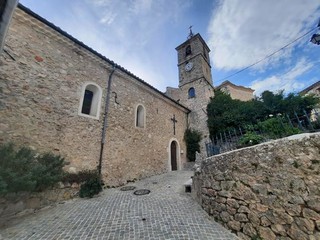 Pittoresca, la chiesa in pietra e il suo campanile.