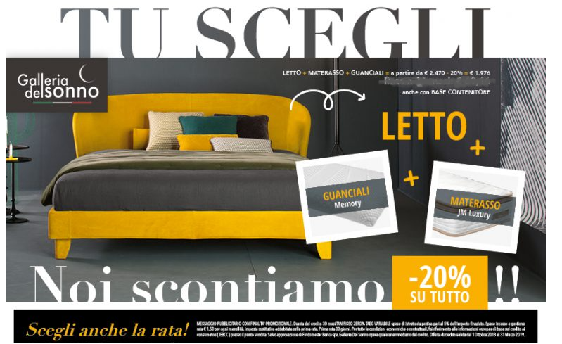 Fino al 31 dicembre, è attiva la promozione “TU SCEGLI NOI SCONTIAMO”. Acquistando un letto, un guanciale Memory e un materasso JM LUXURY, potrai beneficiare di uno sconto del 20%. (Promozione valida solo per l'acquisto dei tre prodotti insieme). Lo sconto è esteso anche su letti singoli, matrimoniali o letti contenitore, materassi a Micromolle Indipendenti e Insacchettate, in Memory, con o senza imbottitura naturale, cuscini in Memory, in fibre naturali o cuscini con nucleo. Puoi scegliere anche altri articoli e verrà applicato su tutto il 20%.