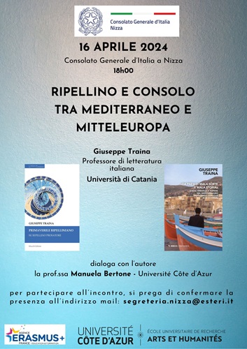 Martedì 16 aprile 2024, alle ore 18,00, il professore di letteratura italiana dell’Università di Catania Giuseppe Traina presenterà i suoi due libri su Angelo Maria Ripellino (1923-1978) e Vincenzo Consolo (1933-2012) nel corso di un colloquio con la professoressa Manuela Bertone dell’Università della Costa Azzurra.
