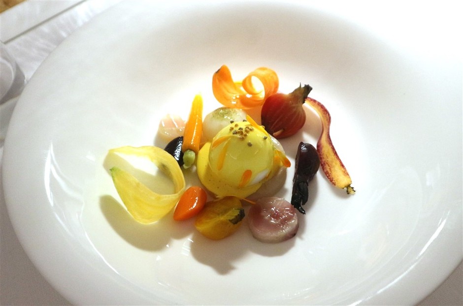 come antipasto un cavallo di battaglia dello Chef, l’uovo rosa Barbapapà questa volta accoccolato su un’insalatina tiepida di radici e fiori con in primo piano la Calendula.