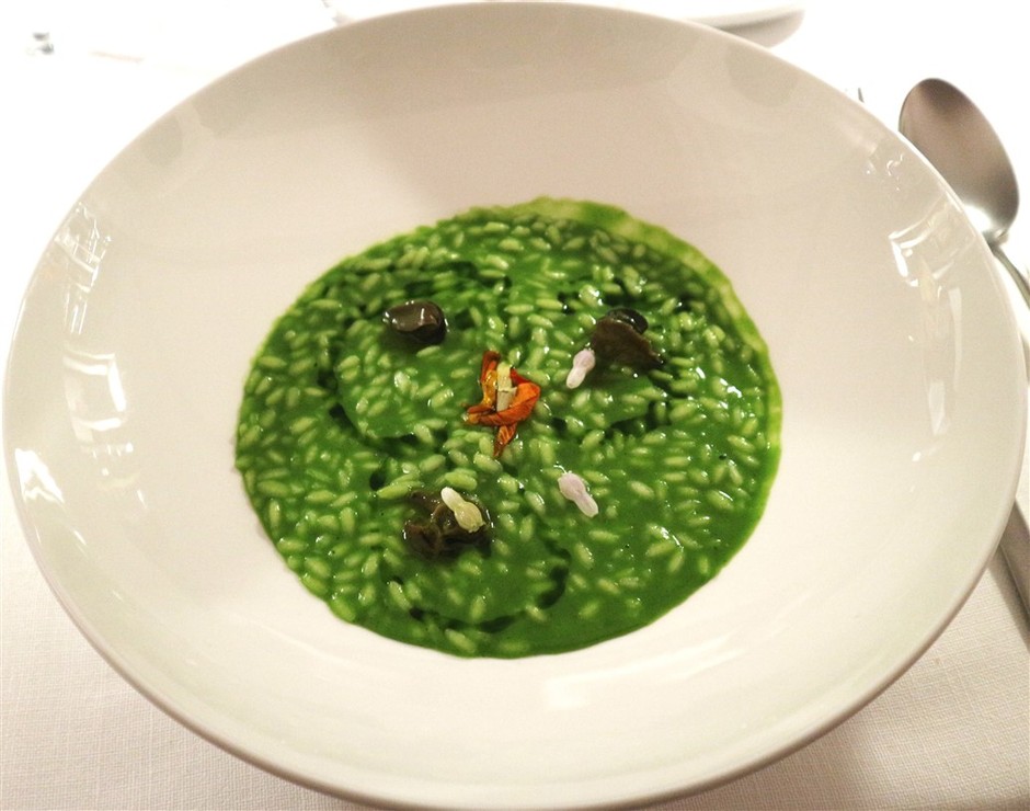 Come primo piatto un giro nel bosco grazie al Risotto all’Aglio orsino e i suoi fiori con lumache, Borragine e suoi fiori.