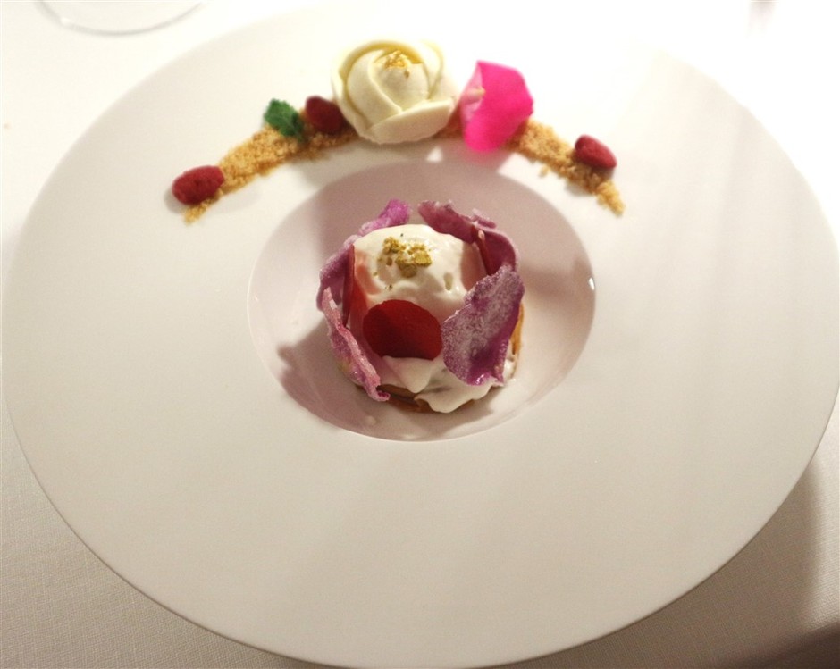 La pasticcera Alice Vialetto ha realizzato un pre-dessert rinfrescante e acidulo di carota e Begonia per prepararsi alla degustazione del suo dolce, una complessità di consistenze, profumi e sapori della primavera, con petali di Rosa caramellati, cioccolato al lampone, Begonia ed acqua di rose su una nuvola candida al profumo di Rosa e lamponi.