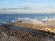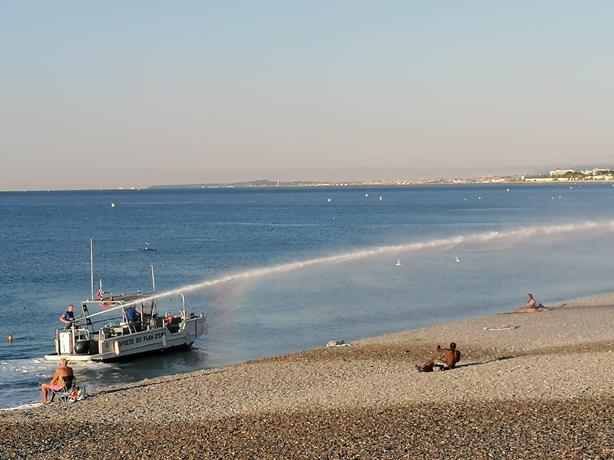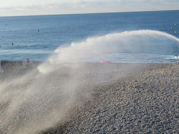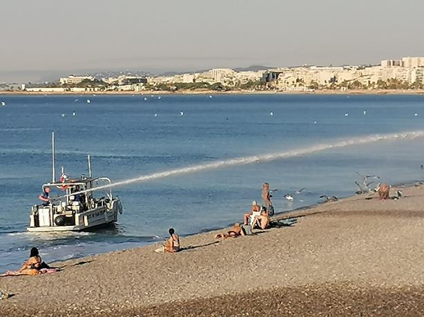 Un gruppo di dipendenti comunali inizia un lungo e meticoloso lavoro di raccolta dei rifiuti abbandonati durante la notte, di svuotamento dei cestini e di sostituzione dei sacchetti. Intanto, dal mare, giunge un forte getto “sparato” da un’apposita imbarcazione, unica nel suo genere in Francia, assicurano i responsabili.