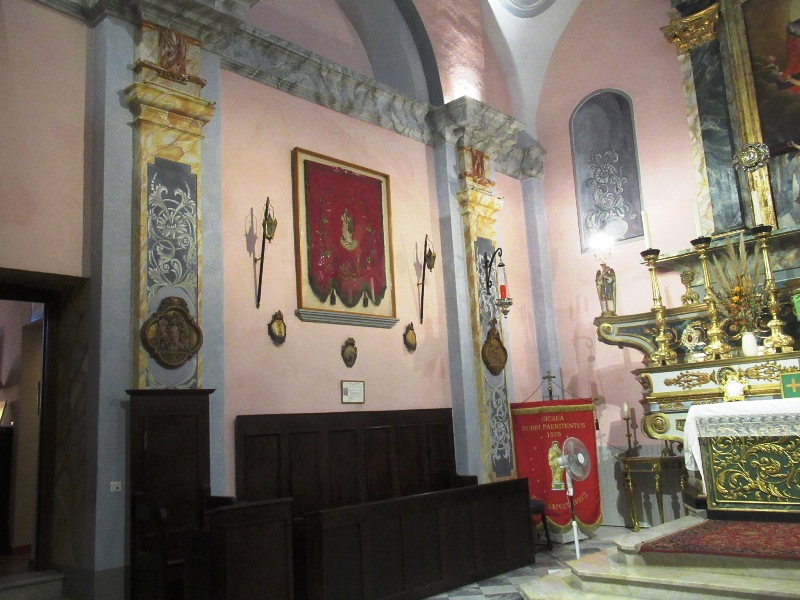 Questa cappella, di forma rettangolare, non estremamente grande, presenta, caso molto raro per i luoghi di culto delle congregazioni penitenziali, una facciata in stile neo classico.