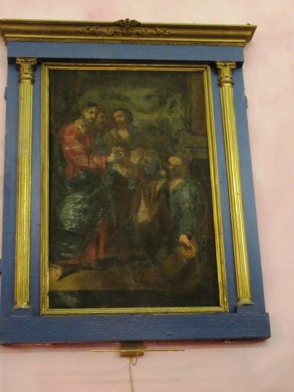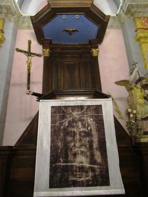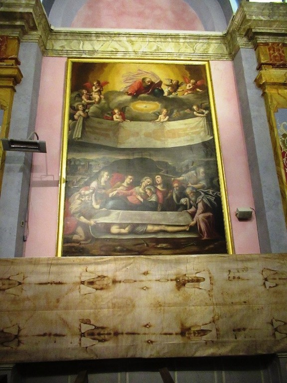 Nella cappella troviamo un quadro risalente al vecchio edificio del 1660 dipinto da Gio Gasparo Baldoino che raffigura la Deposizione di Gesù e l’Ostensione del Santo Sudario da parte degli angeli.