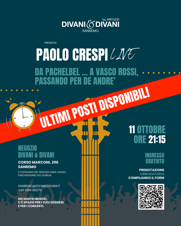 “Apriamo con gioia le porte del nostro showroom – ci raccontano Giulio e Andree – per ascoltare in pieno relax Paolo Crespi live. C’è ancora qualche posto disponibile, consigliamo a quanti interessati di affrettarsi nella prenotazione. Sarà una serata semplice, come in famiglia. Ci sarà spazio per interagire con il maestro Crespi e la possibilità di vincere un esclusivo premio griffato “Divani & Divani”. A tutti coloro che interverranno saremo lieti di offrire anche una speciale gift card”.