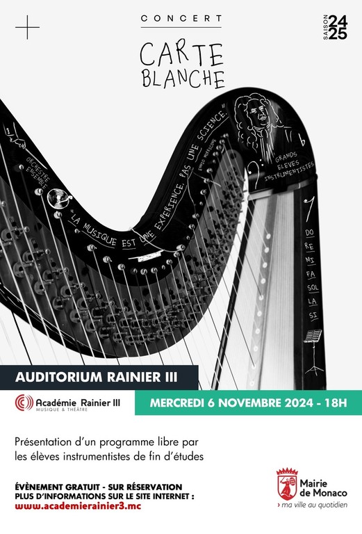 Mercoledì 6 novembre alle ore 18, è all'Auditorium Rainier III che gli studenti strumentisti al termine degli studi si riuniranno per presentare il programma ricco e vario, «Carte Blanche». Un'opportunità per loro di suonare davanti a un pubblico prima di preparare il loro Diploma di Studi Musicali (D.E.M.). Con la partecipazione delle classi di Canto Lirico, Musica da Camera, Violoncello e l'Orchestra dei Giovani.