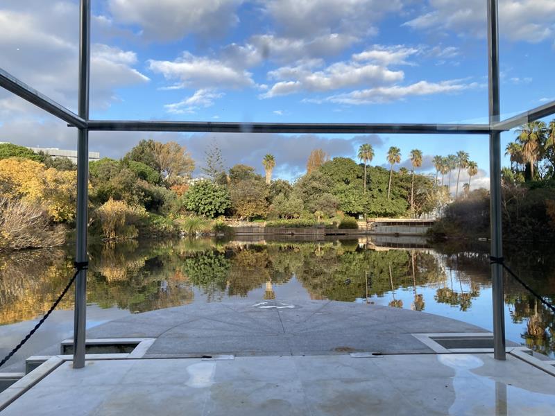 “Da dove spunti?” gli chiedo, mentre i riflessi del lago artificiale e l’architettura fanno il resto rendendo magico il posto.