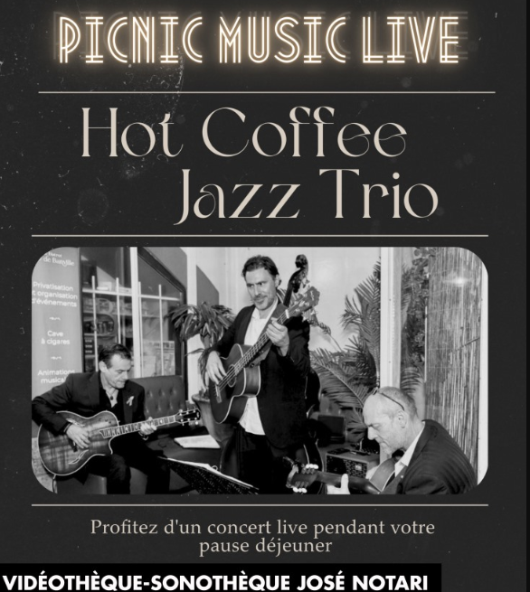 Picnic Music Live - «Hot Coffee Jazz Trio» Martedì 25 febbraio alle 12:15 - Un trio composto da due chitarristi acustici e un bassista, Jazz Hot Coffee si esibisce regolarmente sui palcoscenici della regione. Stile Jazz, Jazz Manouche, Pop e canzoni francesi. (Accesso libero e gratuito)