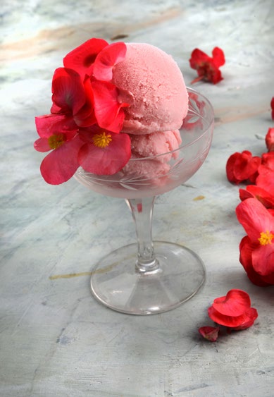 In una vasca per gelato versate la base latte pastorizzata, lo zucchero, il latte in polvere, le maltodestrine, il neutro e quindi il latte intero. Aggiungete i petali di begonia, lo yogurt e la panna, quindi frullate nuovamente. Lasciate a riposare in frigorifero per 6 ore. Dopodiché fate mantecare in gelatiera.