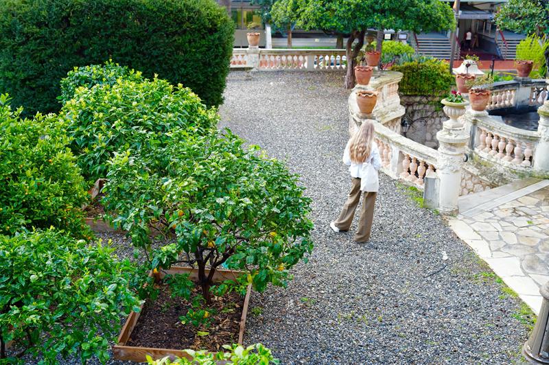 Varcando il cancello si trova un giardino di rose, dalla storia affascinante, ma ora i pergolati sono ammantati da una nuvola bianca che profuma di gelsomino.