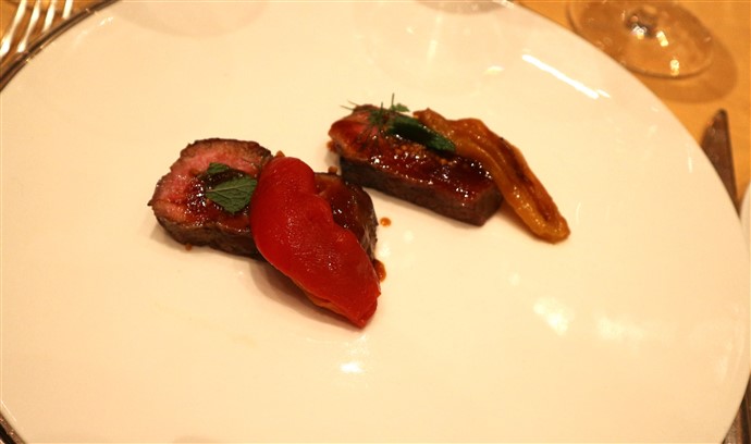 Secondo Piatto: un Controfiletto di Fassona piemontese, servito con peperoni, robiola di capra e un delicato polline, frutto della bravura dello chef Fabio Silva del Ristorante Derby Grill presso l'Hotel De La Ville di Monza. In accompagnamento, il prestigioso Poggio alle Mura Brunello di Montalcino 2019 della cantina Banfi, un vino ricco di struttura e carattere.