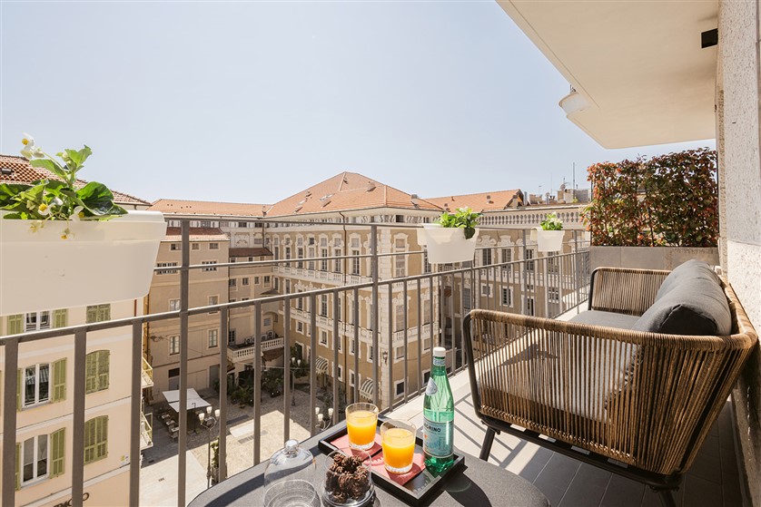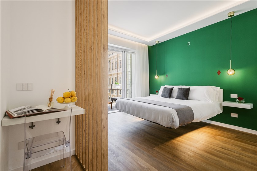Camera Casinò: con i suoi 26 m², questa raffinata camera doppia può ospitare 2/3 persone ed è dotata di un letto matrimoniale e di un divano letto nel salottino. Il suo terrazzino privato si affaccia su Piazza Borea D’Olmo, creando un’atmosfera intima e accogliente, perfetta per concedersi attimi di relax.