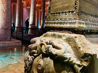 Una volta sulla riva europea, il tono cambia. La Moschea Blu, con le sue cupole armoniche, è nascosta da restauri che sembrano infiniti. Si intravede, come un volto dietro un velo. Poco distante, Santa Sofia racconta il passaggio della storia: chiesa, moschea, museo e di nuovo moschea. Oggi è accessibile solo dal piano superiore per i non musulmani. Il contrasto tra i fedeli in preghiera e i visitatori rumorosi dice molto del presente. Il pavimento in marmo, le calligrafie dorate, i mosaici bizantini creano un’atmosfera sospesa tra fede, arte e potere. Poi si scende, sotto terra, dove si nasconde una delle sorprese più emozionanti: la Basilica Cisterna. Le colonne si mostrano imponenti, la luce è tenue, l’atmosfera quasi mistica. Si ha l’impressione di entrare in un mondo parallelo, un luogo protetto, dove il tempo si è fermato. Le gocce d’acqua cadono dal soffitto ritmicamente e l’eco dei passi accompagna la visita, in un silenzio che parla. È uno dei luoghi più intimi della città, un invito alla lentezza, alla riflessione. Qui Istanbul non si mostra, si lascia sentire. Il Gran Bazar, con le sue cupole e i suoi corridoi affollati, oggi è più una scenografia che un mercato vivo. Ha perso parte delle sue origini. Le voci autentiche si confondono con i richiami costruiti per il turista, i prezzi sono gonfiati, le contrattazioni spesso inscenate. È un luogo che affascina più per la sua architettura che per la sua funzione: uno spettacolo visivo, più bello da vedere che da vivere.