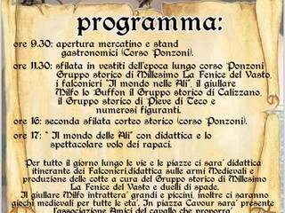 Per tutto il giorno infine, lungo le vie e le piazze ci sarà didattica itinerante dei Falconieri, didattica sulle armi medievali, duelli di spade, produzione delle cotte a cura del gruppo storico di Millesimo 'La Fenice di Vasto'. Grandi e piccini saranno intrattenuti dal giullare Milfo; previsti giochi medievali per tutte le età. In piazza Cavour sarà presente l'associazione 'Amici del cavallo' che proporrà didattica e battesimo della sella.