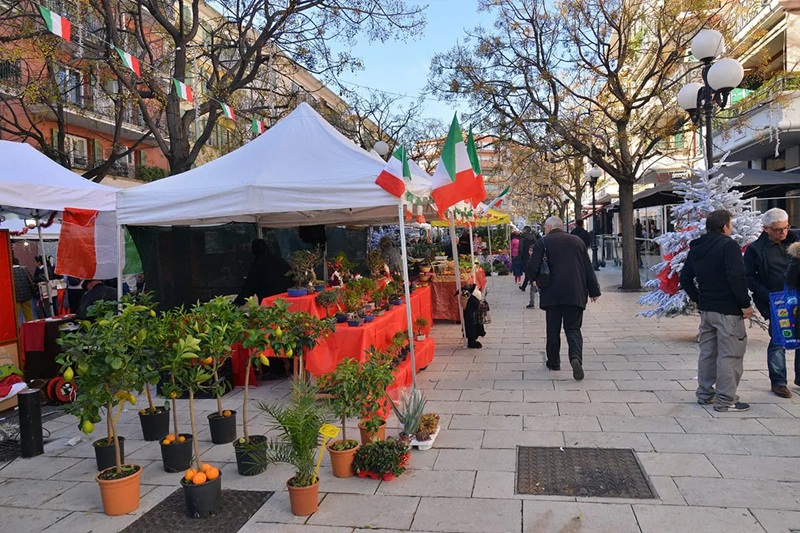 Tra le bancarelle si troveranno prelibatezze come formaggi, salumi, vini, biscotti, miele e tisane, ma anche borse in pelle, sciarpe, abiti per tutte le stagioni, piante aromatiche e fiori. Un vero e proprio angolo d’Italia trapiantato nella Costa Azzurra.