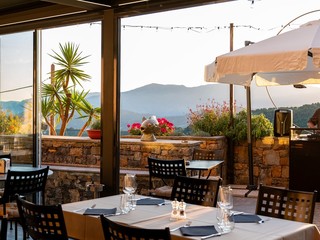 L’ambiente, sobrio ed elegante, accoglie gli ospiti in una terrazza panoramica che domina il verde delle colline e il blu del mare sullo sfondo, regalando un’atmosfera suggestiva in ogni stagione.
