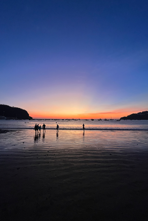 Al tramonto, San Juan si adagia nella sua conca come una creatura stanca che trova finalmente riposo. Il villaggio si scalda: i muri delle case diventano arancio tenue, le lamiere dei tetti riflettono bagliori intermittenti. La sabbia, liscia come velluto, separa l’oceano dal paese con una curva perfetta. Le barche restano ferme sull’acqua, allineate come note su uno spartito. La luce si allunga attraversa le palme e accarezza i volti di chi resta seduto a guardare, mentre sulla spiaggia vengono accesi i primi falò. È un momento in cui tutto sembra rallentare, come se il villaggio si fermasse per un istante a contemplare sé stesso, prima di tornare a vibrare. La sera, tutto si trasforma. I blackout spezzano il ritmo, le torce aprono varchi tra le ombre. Nei bar si balla, si beve, si dimentica. Le risate si confondono con la musica, gli sguardi si intrecciano come in una città di frontiera. Il turismo qui ha un accento preciso: quello nordamericano. Canadese, per lo più, e statunitense. Molti arrivano dal sud della California, zaino in spalla, tavola da surf sotto il braccio, e quella fame di esotico a buon mercato che trova qui una risposta semplice: onde, rum, tramonti. Sono giovani, spesso in pausa da qualcosa: un lavoro, un’università, una relazione. Cercano libertà e leggerezza, e San Juan gliele concede volentieri. C’è un’assenza che si nota. L’Europa è lontana, non solo geograficamente. Mancano i turisti che osservano prima di ordinare, che si portano dietro la voglia di capire più che di conquistare. Questo, forse, contribuisce a creare un piccolo paradosso: San Juan è Nicaragua, ma a tratti sembra una bolla scollegata dal resto del Paese. Una stazione di sosta per viaggiatori in cerca di qualcosa, ma non sempre sicuri di cosa.