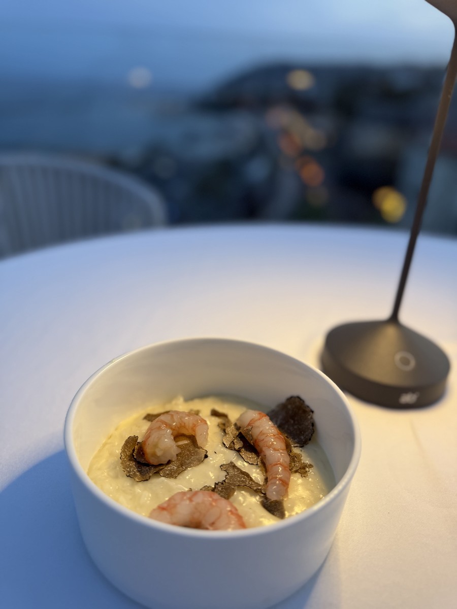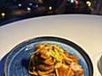 Tra le portate servite: ostrica fritta con bisque di gamberi e salsa al caramello; carpaccio di tonno con fichi freschi, cipolla in agrodolce e salsa alle foglie di fico; risotto ai gamberi di Sanremo e tartufo nero; tagliolino con gamberi, zafferano e fiori di zucchina.