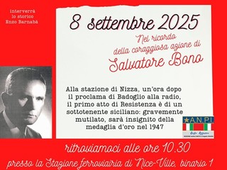Il ricordo di Salvatore Bono é affidato, lunedì 8 settembre 2025 alle ore 10,30, all'ANPI Costa Azzurra. Il ricordo é affidato allo storico Enzo Barnabà.