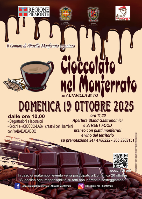 Segui gli aggiornamenti sulla pagina Facebook "Cioccolato Nel Monferrato - Altavilla Monferrato" e su Instagram @cioccolato_nel_monferrato.