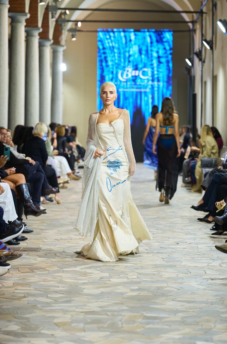 Sul podio, modelle sorridenti e un’ospite speciale: l’influencer Tocestyle, seguita da oltre un milione di fan, che ha chiuso lo show indossando un abito dipinto a mano con il messaggio “Save the Ocean”, realizzato a partire da reti da pesca riciclate.