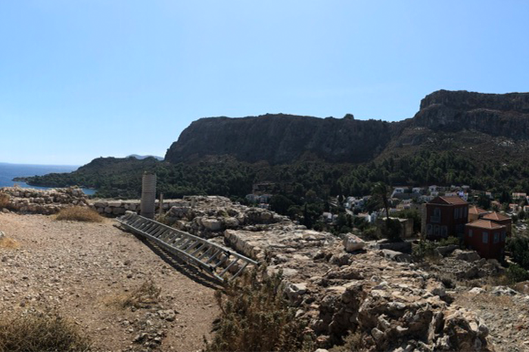 Il pomeriggio dilata i vuoti. Le persiane si socchiudono, il mare cambia gradazione, le facciate delle case rilasciano calore. Si cammina senza una direzione precisa, tra scale ripide, vicoli e cortili nascosti. Kastellorizo è un’opera d’arte urbana che non ha bisogno di pubblico né di applausi. Tra uno scorcio e un balcone fiorito affiora la sagoma del Castello dei Cavalieri, eretto anticamente per controllare la baia. È una sentinella di pietra, memoria di quando questo lembo del Dodecaneso era presidio e frontiera prima che rifugio. Oggi non reclama sguardi, ma li cattura: ricorda, sottovoce, che anche questo luogo ha avuto bisogno di difesa. La vista si apre sull’intera insenatura. Dall’alto il disegno si ricompone: molo, scogli, barche ormeggiate e una linea tesa verso la Turchia, così vicina da sembrare toccabile. Poco oltre, un sentiero conduce alla cappella di San Giorgio, bianca e raccolta, affacciata sull’acqua. È una sosta breve, un invito a prendere fiato.
