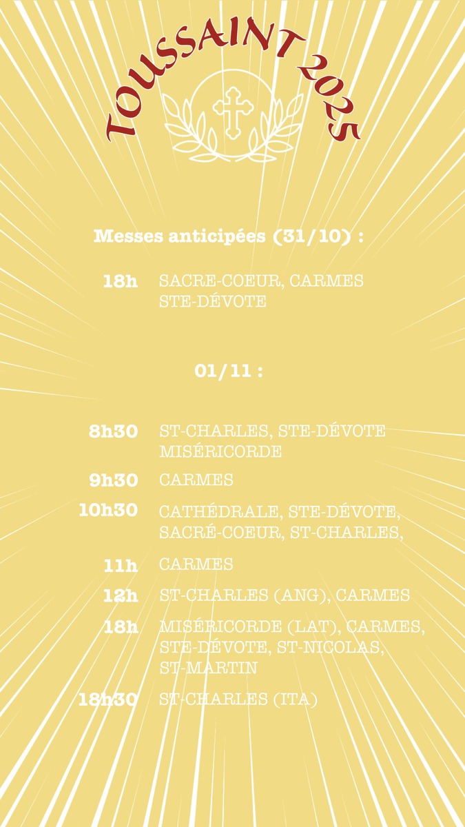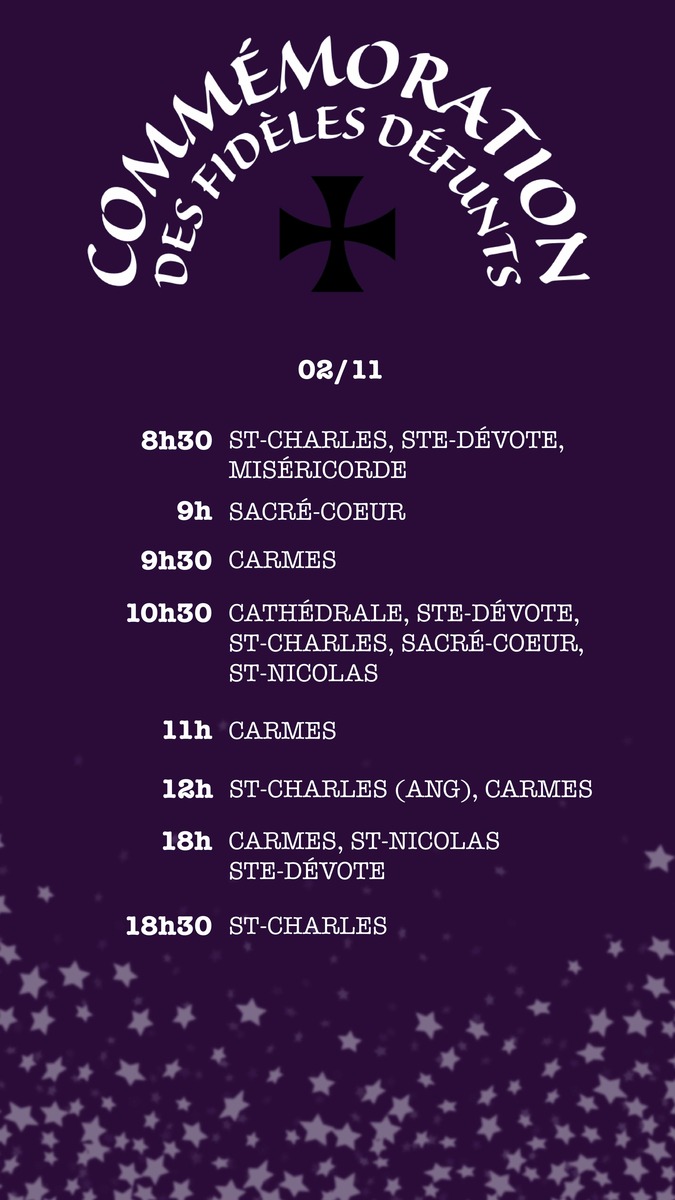 Le celebrazioni della Tutti i Santi inizieranno con le messe anticipate giovedì 31 ottobre nelle parrocchie del Sacré-Cœur, dei Carmelitani e di Sainte-Dévote alle ore 18.00.