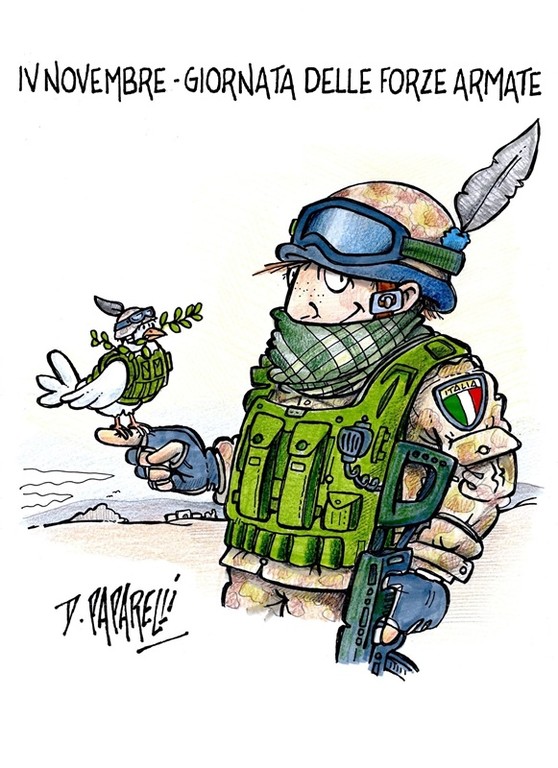 Il nostro collaboratore Danilo Paparelli, noto vignettista che ha firmato anche alcuni carri del Carnevale di Nizza, ha dedicato al 4 novembre, giornata dedicata alle Forze armate che, negli ultimi anni, sono state (universalmente) sempre più al centro dell'attenzione, mentre noi le vorremmo protagoniste solo per missioni di pace o di supporto alle emergenze, questa simpatica vignetta.