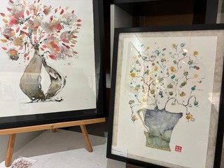 Laurence G. ama esplorare nuove tecniche e sperimentare: accanto all’acquerello compaiono infatti anche lavori a inchiostro di china, testimonianza di un interesse profondo per l’arte giapponese e per l’armonia delle composizioni ikebana, che l’artista sigla con un caratteristico timbro rosso.
