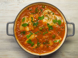 In una cocotte in ghisa, scalda abbondante olio d’oliva e rosola porro, cipolla, aglio, peperoni e il mazzetto aromatico. Quando iniziano a dorarsi, aggiungi lo stoccafisso, lascialo insaporire e sfuma con l’acquavite.
