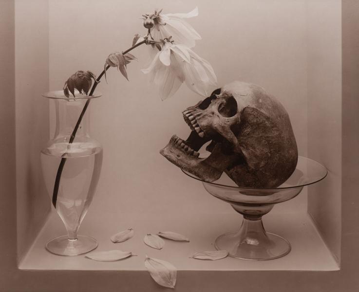 L’esposizione si apre con una scena simbolica: al centro, l’interno stesso della camera oscura, “cuore” del processo fotografico; ai lati, due leoni di pietra fanno da guardiani tra luce e ombra, vita e morte. Intorno, colonne lignee ornate di fiori e denti di narvalo, reminiscenze di un mondo arcaico, evocano i cabinets de curiosités del Rinascimento, microcosmi di meraviglia che univano scienza, arte e mito.