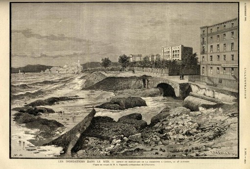 « Les inondations dans le Midi. Aspects du boulevard de la Croisette à Cannes, le 28 octobre 1882 ». L’Illustration, n° 11 novembre 1882.