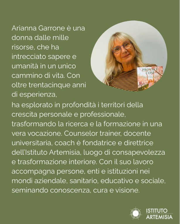 Arianna Garrone è una donna dalle mille risorse, capace di intrecciare nella sua vita personale e professionale competenze diverse e complementari: Counselor Trainer e Supervisor, Docente Universitario, Coach, Professionista Olistica ed Erborista. Da oltre trentacinque anni dedica la sua energia alla ricerca, alla formazione e all’esplorazione delle dinamiche interiori, trasformando ogni esperienza in un tassello di un sapere vivo, autentico e condivisibile.