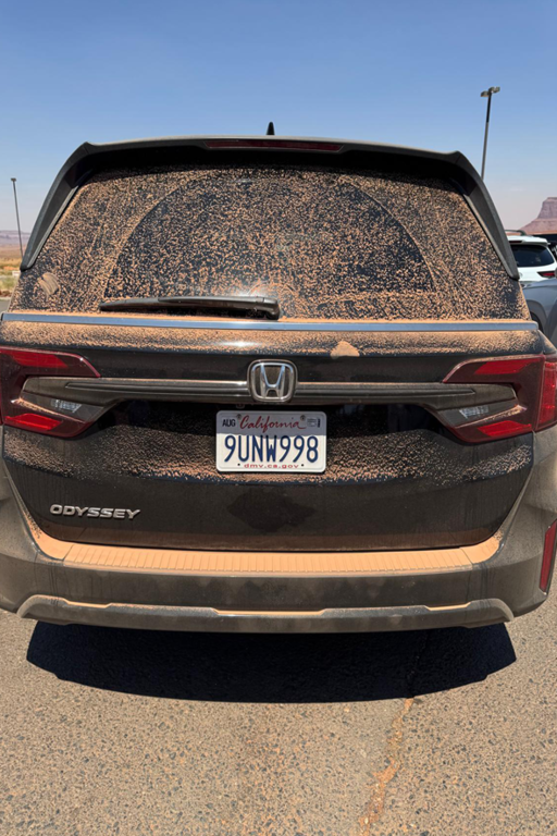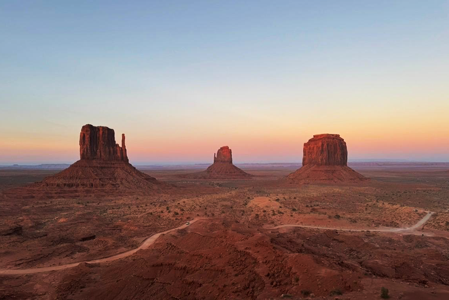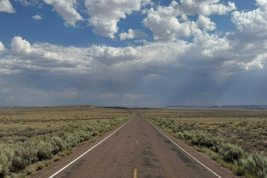 Sì, fin dai primi chilometri. Dopo Los Angeles siamo entrati immediatamente nei parchi della California. Joshua Tree National Park è stato il primo: luce violenta, sole, cielo azzurro e una prateria che sembra un forno ventilato. Gli alberi e le rocce modellate dal vento creano un ambiente quasi alieno, che disorienta e affascina allo stesso tempo. In Arizona abbiamo attraversato Petrified Forest National Park e la Painted Desert. Qui il paesaggio cambia anche restando fermi: tronchi pietrificati, colori stratificati, orizzonti che sembrano muoversi. Poi la Monument Valley, talmente iconica da sembrare irreale, sospesa tra geografia e immaginario.
