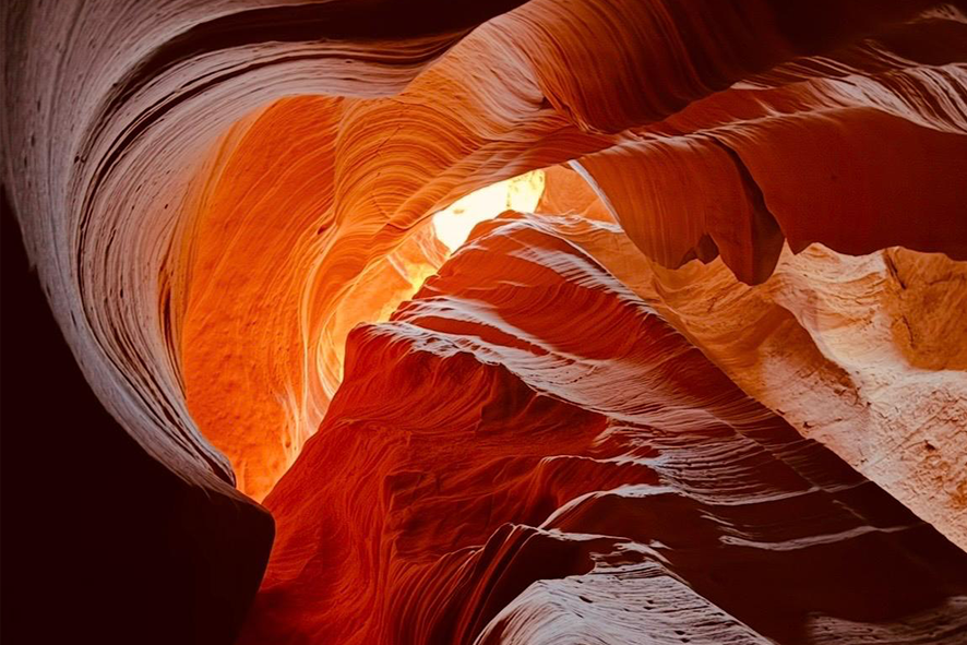 Arriviamo a Page, dove si trova Horseshoe Bend, l’ansa perfetta del fiume Colorado, una forma così regolare da sembrare disegnata. Poco distante c’è Lake Powell, un lago artificiale incastonato tra le rocce rosse. Poi Antelope Canyon. Dove abbiamo scelto Canyon X, meno affollato e più raccolto. Qui la luce entra lentamente, scivola sulle pareti e le scolpisce con le ombre. È il luogo che più di tutti mi è rimasto addosso. Il fatto che non lo attraversi soltanto: lo vivi. Si entra solo con guide navajo, che raccontano la storia del canyon e il suo significato profondo. Cammini dentro una scultura modellata dall’acqua e dal vento in migliaia di anni. A un certo punto, una guida inizia a suonare uno strumento tradizionale. Il suono rimbalza sulle pareti, amplificato dallo spazio. In quel momento capisci che non stai semplicemente osservando un luogo, ma partecipando a qualcosa di più grande.