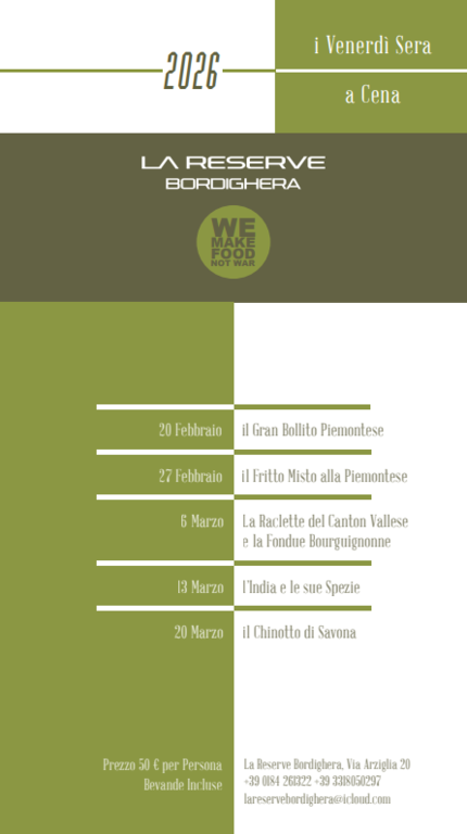 Eccellenza gastronomica e ottimi vini in un'atmosfera suggestiva. Il 27 febbraio nel ristorante “La Réserve”, incastonato nella scogliera di Bordighera, andrà in scena la seconda serata a tema. Dopo il successo del primo appuntamento dedicato al gran bollito piemontese accompagnato dalle sue sette salse, il protagonista de "I venerdì sera a cena" sarà il fritto misto alla piemontese.