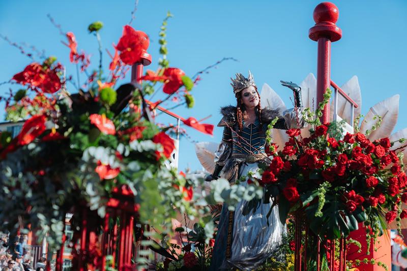 La tradizionale battaglia dei fiori, con carri decorati e lanci di composizioni floreali verso il pubblico.