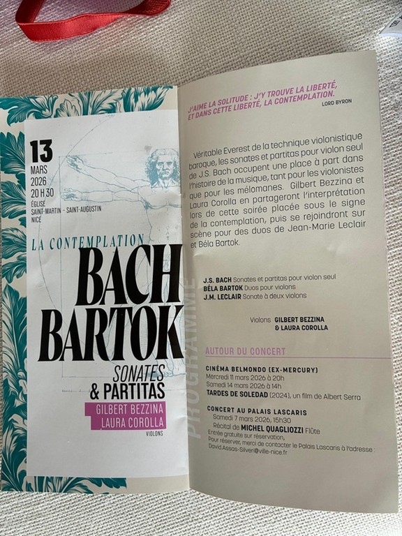 Il concerto di venerdì 13 marzo alle ore 20,30, nella chiesa barocca di St-Martin / St-Augustin, vede protagonisti due grandi violinisti solisti: lo stesso Gilbert Bezzina, che abita nella Nizza barocca e vive il barocco anche nella quotidianità, e Laura Corolla, reduce da tournée europee e in arrivo con un violino “nuovo e fiammeggiante”, costruito a Cremona alla fine del Seicento.
