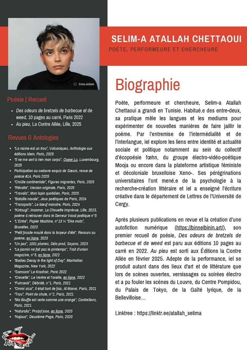 Accanto agli artisti professionisti troveranno spazio anche le voci del territorio: saranno infatti presentate le creazioni poetiche dei residenti del FAM di Breil-sur-Roya e dell’EHPAD di Saorge, accompagnati da Sabine Venaruzzo, così come i poemi realizzati dai bambini della scuola di Saorge/Fontan, seguiti da Léa Arson. A completare il programma, la restituzione pubblica dei testi prodotti durante il laboratorio di scrittura della mattina.