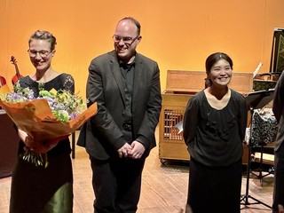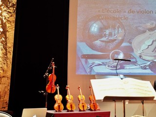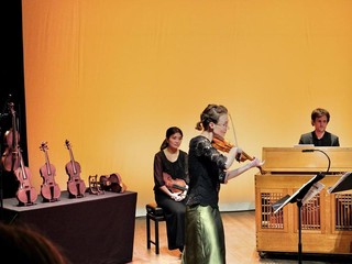 La prima sorpresa era che i violini non erano due, come le giovani violiniste, una francese e una giapponese. Sulla scena facevano bella mostra ben 7 violini, il più antico del 1750, gli altri fedeli riproduzioni fatte ora. I violini avevano un manico diverso da quello attuale e delle corde in budello di pecora.