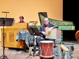 La stessa cosa per questo grande strumento, la tiorba; il tiorbista/percussionista spagnolo ci ha mostrato in modo divertente come le percussioni davano un ritmo libero nella musica barocca e ha presentato tutta la panoplia di strumenti percussivi: tamburi, tamburelli, nacchere, e perfino liste di parquet (imitando anche versi di uccelli). Quanto all’interprete di viola e viola da gamba, anche questi, basso continuo, non fanno parte della stessa famiglia.