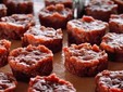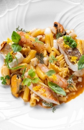 Tra i piatti: Zuppa di Mare. Pasta mista, primizie e agrumi. L'ispirazione è la Mesca Francesca, qui fatta con il mare. Risottata con un brodetto dell'Adriatico, che sprigiona una sapidità intensa e a completare trancetti di pescato succulenti e limone di Amalfi. L'Agnello. Melanzana, Provola e pomodoro.