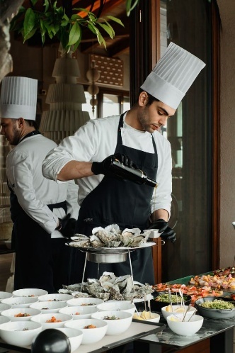 Tra i piatti più golosi: Insalata di gamberi, radicchio, ceci, e sesamo. Tartare di tonno, cetriolo, mandorla e dressing colatura di alici, Pizza di scarola, Vitello Tonnato, Risotto allo Scoglio e Beef Wellington. Colomba e Uova di cioccolato.