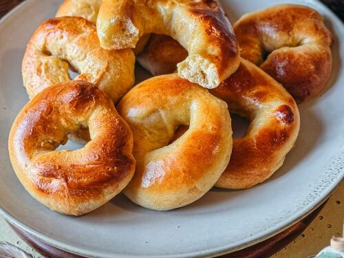 Sgonfiare delicatamente l’impasto e dividerlo in piccoli cilindri. Unire le estremità formando anelli di circa 10 centimetri di diametro.